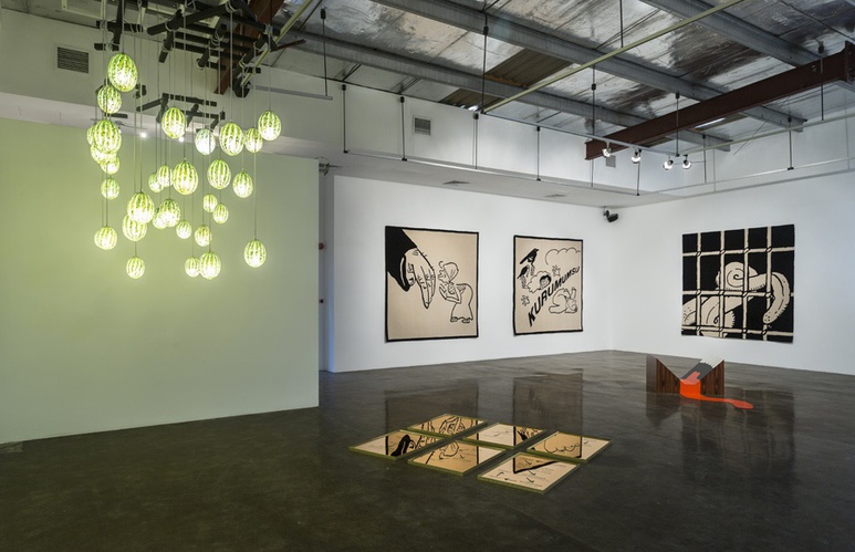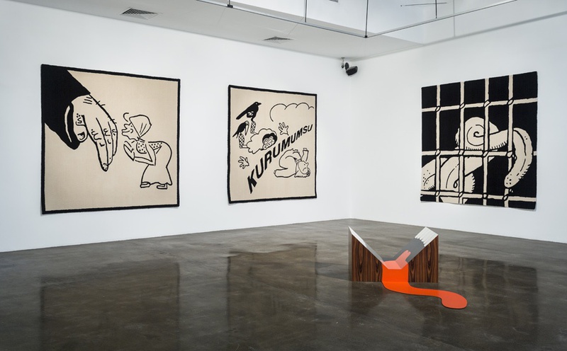 ST: This series of carpets are called the 'Long Live' carpets, and the carpets use Mayakovsky drawings in which we intervene and address issues of language politics within the Turkic sphere. In fact, the Latinization of the Turkish language is the most successful example of the conversion of a script, at least in recent history. Even the most Salafist Turk doesn't ask for the return of the Arabic alphabet, it's kind of a done deal.