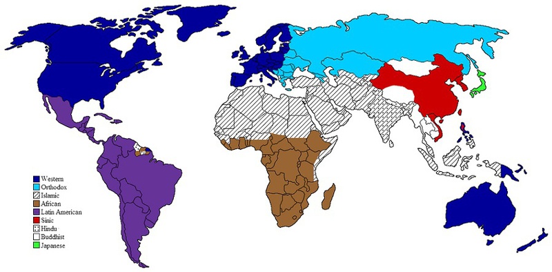 Take Huntington's logic of planetary classification as depicted in the legend from the map above. The 'West' – North America, Canada, Europe and Australia – is positioned on the top of the list, and is the civilization that classifies the remaining eight according to the following categories: 'Western', 'Orthodox' (meaning eastern Christianity), 'Islamic', 'African', 'Latin American', 'Sinic', 'Hindu', 'Buddhist', and 'Japanese'. Now consider here the mapping of Islam – the main the reason why Huntington wrote his book – and Africa. The map makes it clear that it is in North Africa and not Sub-Saharan Africa where the majority is Muslim, thus severing Black Africa and Muslim Africa from each other. Indeed, what the BRICS[10] also have in common – along with the rest of the world order after decolonization during the Cold War – is that all of them have been racialized (ranked below the 'West', the 'First World', or the 'North').