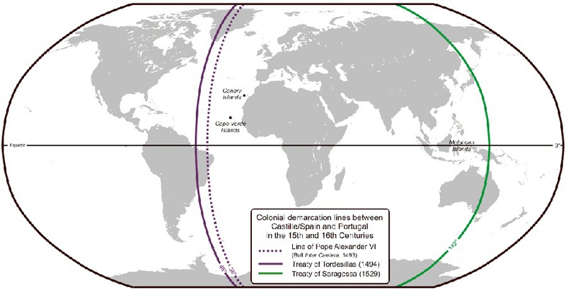 [12] By 1530, the planet, mapped by the Pope and the Crowns of the Iberian Peninsula looked more or less (because no one had at that time the image of the planet we have today) like this: http://2.bp.blogspot.com/-T3eDVJSns1A/T533RNgRwtI/AAAAAAAABAU/NWB-oO5jzP4/s1600/treaty+of+Tordesillas.jpg.