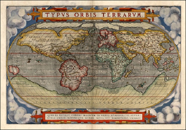 By the mid-sixteenth century, Gerardus Mercator and later Abraham Ortelius (Typus Orbis Terrarum) drew the world map that is familiar to all of us today. But though we may tend to believe that this is what the planet looks like, it doesn't. Take Asia, Africa and Europe: these three 'continents' existed at the time only in the minds of Christians inhabiting Europe. Asians did not know that they lived in Asia until approximately 1582 when Jesuit missionaries visited China and told them that according to the Christian concept of the earth they lived in Asia![14] For that reason, embedded in the Ortelius map is the T-and-O map, and the drastic consequences of sixteenth century mapping was the disavowal and devaluation of non-western cosmologies and territorial imaginaries. The first nomos of the earth, in Schmitt's terms, was superseded by the second nomos that homogenized and universalized the belief that the planet really looked the way Christian European mapmakers of the sixteenth century believed it to look like.[15] Western cartography shuttered everyone else and made us see the planet according to the eyes of western cartographers.
