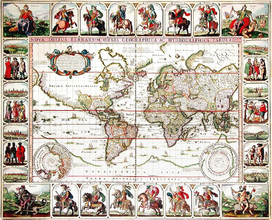 Here you have an answer to the general question of this platform: North Africa is indeed located in the 'Global South'. The definition also notes that the 'Global South' includes 'developing Asia and the Middle East'. I will now set about problematizing these fictions and mappings by recalling the distribution of the planet and its inhabitants as depicted in many European maps of the seventeenth century. Let's take one at random: Visscher's world map from 1652.