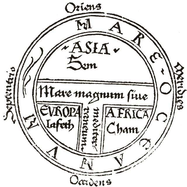 In this map, and thus at this time in history, the 'North/South' divide was already implied. After all, the magnetic compass was already in use to determine the four cardinal points of the globe. But before the magnetic compass was invented, the 'top' was occupied by the place where the sun rises: the Orient. That is why we say today: 'orientation'. And we say it even if we are 'orienting' ourselves with the 'North' as point of reference.