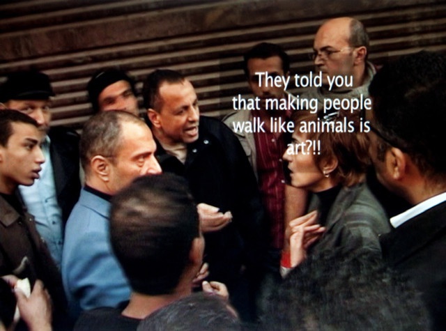 Initially, Kenawy wanted her art students to perform the work, so as to refer to the culture of hierarchies perpetuated within the Egyptian educational system. However, at the last minute, these students withdrew their participation prompting the artist to hire 'workers' to perform as actors. For her, this change in the kind of participants - the reasons behind their involvement and how they were asked to perform - did not change the meaning of the work. But before elaborating on the implications of employing workers - day labourers, essentially - to crawl on the street as part of an art performance, I would pause to reflect on why a group of middle class art students decided to silently withdraw their participation. Did they fear the humiliation that they might encounter on the street? Was this last minute silent withdrawal a resistance to the dominant 'sheep mentality' that Kenawy was criticising? Or were they simply not convinced of the gesture?