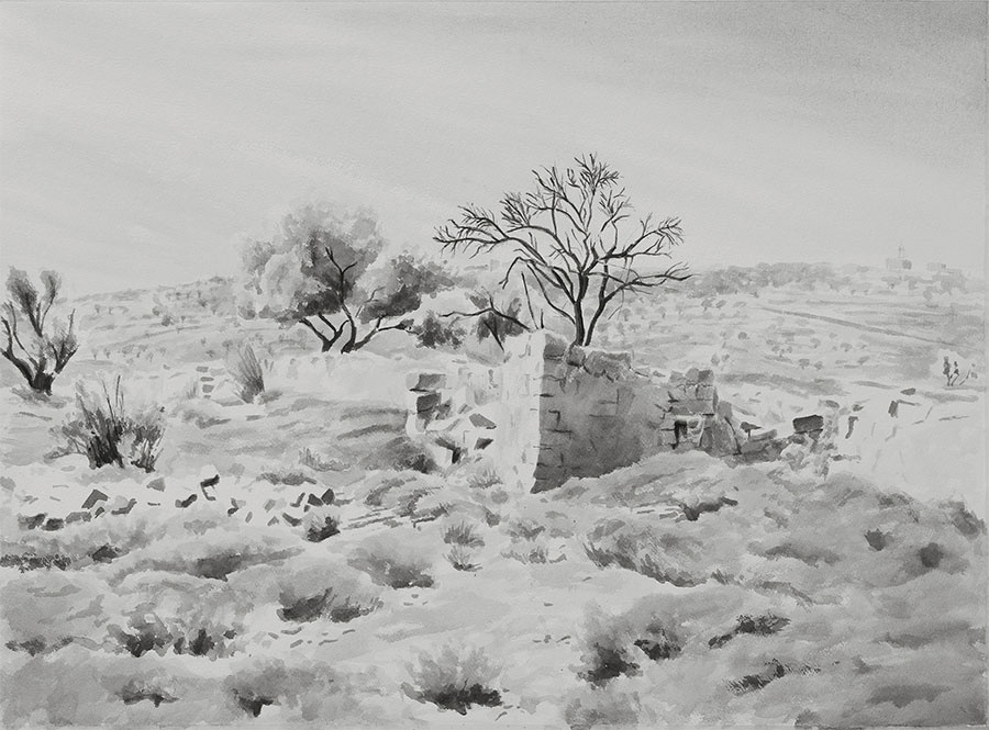 Thus arises the need to perform archaeologies of history, memory and experience, and to produce proposals for future architectures beyond our desire to resurrect a spectral past: that elusive 'home'. Only then might we be face an inconclusive present mired by global inequality and instability for what it is, and make something more out of it. It is this logic that informs Bashar Alhroub's project, Less Holiness, a drawing presented at Al-Ma'mal (The Tile Factory), which intends to dismantle the stereotypical image of Jerusalem as a holy city so as to expose what lies behind it: what Alhroub calls 'a reality of struggle and fragmentation'.[15] In the case of Benji Boyadgian, his response also seeks to bring another view of the city to light through paintings depicting the ruins of field houses, Qusurs or Manateers, in Wadi el-Shami: what he describes as 'a timeless journey in this fractured landscape, transcended from its context'.[16]