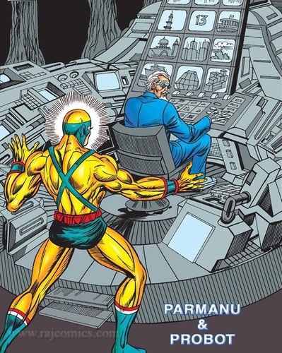 Parmanu is an Indian comic strip named after its hero: 'Atom'. In this wonderful image Parmanu stands over an accomplice called Probot: a 'starchitect' working on a series of gestural buildings that can only be a reference to Gehry and his spectacular shops. Probot is intently digging up some local context or reference to stick together with that angular or 'inspiring!' shape on the bottom screen as a proposal for the next Guggenheim perhaps.