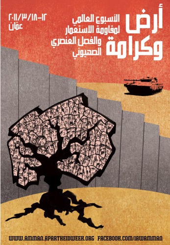 I will present some examples of projects that I have been involved in, in the hope of offering a personal reading on these thoughts and questions. In 2011 and together with nine other individuals, we set up Ard wa Karama, a collective organizing for Israeli Apartheid Week in Amman. For two years, we put on an annual programme of lectures and discussions, film screenings and concerts to shine light on the oppressive practices of the Israeli occupation of Palestine. We invited activists, historians, politicians and artists from Jordan, Palestine and South Africa to share their experiences and stories with audiences in various locations around the city. We were informal political and social activists, but were able to bring visibility to prevailing but under-represented issues in Jordanian society: the boycott of Israeli goods and normalization as an example. The initiative did not continue past the two years, but some of its members later formed an offshoot committee that works specifically to tackle boycott issues in Jordan that is still active till today.