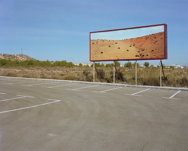 MC: I selected the artists purposefully looking for non-traditional or unexpected perspectives on landscape. For example, Halida Boughriet's video Transit (2011) is more of a sky-scape than a landscape, but speaks about a human landscape through the stories in the voice-over. Jananne Al-Ani's aerial views from Shadow Sites II (2011) could be mistaken for abstract paintings, while Corinne Silva's landscapes within landscapes, Imported Landscapes (2010), which are the largest in the show, are visually deceptive making the viewer look twice so as to understand whether they are looking at a real billboard within a billboard. The main difference is between the video format that Boughriet and Noor Abed use and the still photographs, with the two media conferring a completely different feel to landscape.