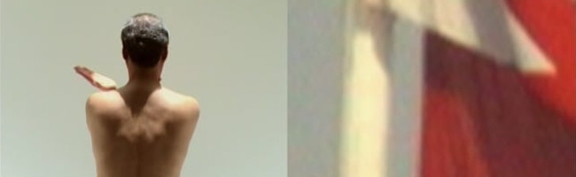 Anas Al-Shaikh's two-channel work My land, 2 consists of a close-up video of Bahrain's red-and-white flag and another presenting the artist's naked torso with his back to the viewer.