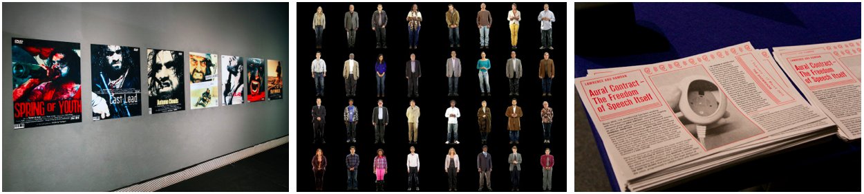 L-R: Tarzan & Arab, Posters from the Gazawood Project, 2010, installation view, Subversion, Cornerhouse, Manchester, 2012. Photograph by WeAreTAPE.com. Courtesy and © the artists and Cornerhouse, Manchester; Joana Hadjithomas and Khalil Joreige, A Letter Can Always Reach its Destination, 2012, video still. Courtesy of the artists and Abraaj Capital Art Prize; Lawrence Abu Hamdan, Aural Contract: The Freedom of Speech Itself, 2012, installation view, The Showroom, London. Courtesy of the artist and The Showroom, London.