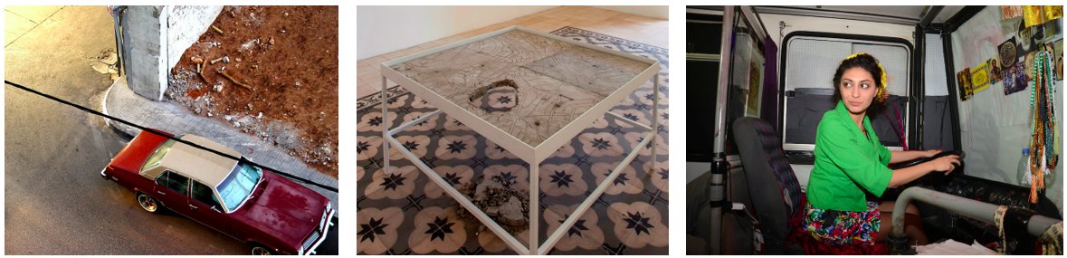 L-R: Sinisa Vlajkovic, Across The Street, Beirut, Lebanon, 2003, photograph. Courtesy of the artist; Saba Innab, Untitled, 2011, reinforced concrete map on steel table, 100 x 100 cm. Courtesy of the artist; Bus Cemetery, a project by Dictaphone Group, 2012. Courtesy of Dictaphone Group.