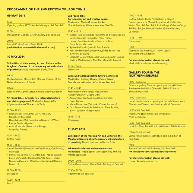 Further participants to the panel talks include: Redha Moali (Art Centre Dar Al Ma’Mûn, Marrakech, Morocco), Djamil Aïssani (Art Complex to Museum of Water Toudja, Bejaïa, Algeria), Akila Mouhoubi (Association Rivage, Marseille, France), Adel Essadani (Abattoirs de Casablanca, Casablanca, Morocco), Mohamed Ben Soltane (B’chira Art Centre, Sidi Thabet, Tunisia), Faten Mehouachi (Maison des Arts, Tunis, Tunisia), Mohamed Morabiti (Résidence d’artistes Al Makam, Marocco), Vincent Puig (Institut de Recherche et d’Innovation du Centre Georges Pompidou, Paris, France), Hassan Darsi (Atelier de la Source du Lion, Casablanca, Morocco), Syhem Belkhodja (Ness El Fan, Tunisia), Paul Vandenbroeck (Musée Royal des Beaux-Arts d’Anvers, Belgium), Elisabeth Cestor (Musée des Civilisations de l’Europe et de la Méditerranée, MuCEM, Marseille, France), as well as Cyrine Gannoun and Jihène Turki from Tunisia's Ministry of Culture, and art collector Adel Hamida. The panel talks will be hosted by key players of the regional and international art scene, such as Moez Safta (Higher Institute of Fine Arts, Tunis), Marie-Monique Steckel (French Institute, Alliance Française, New York), Nadia Zouari (artist and journalist) and Alia Hamza (journalist).