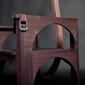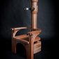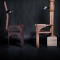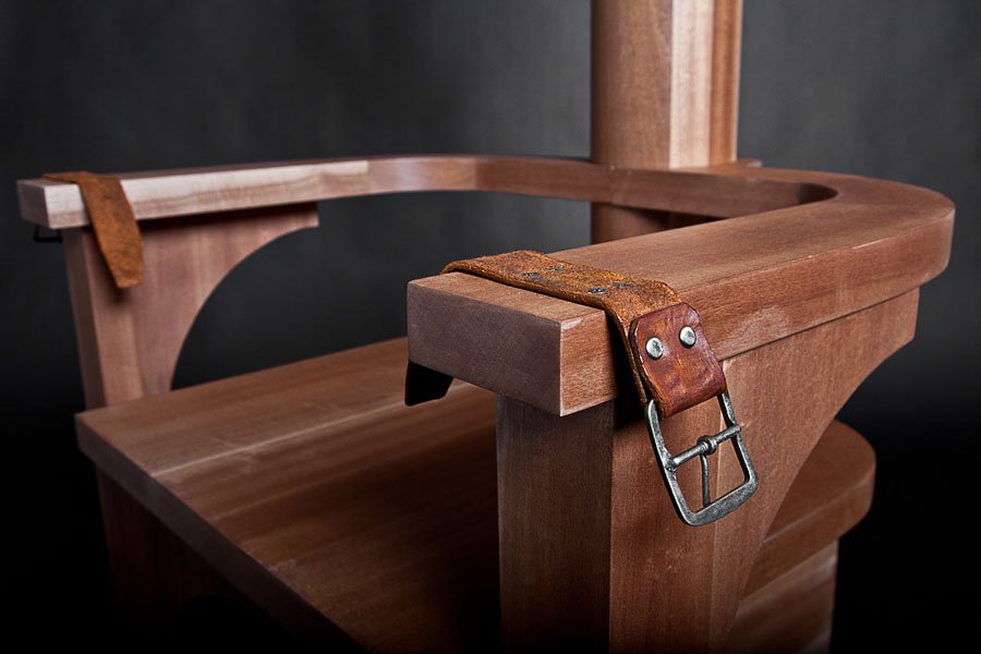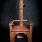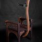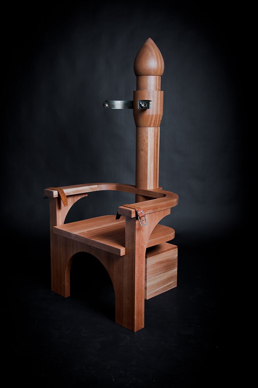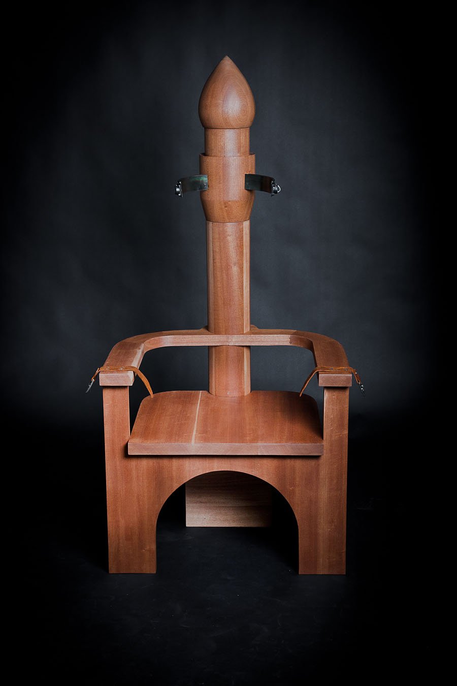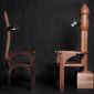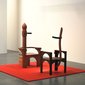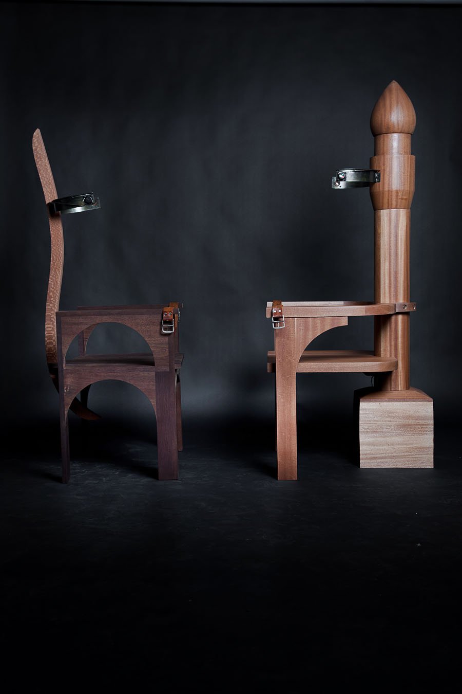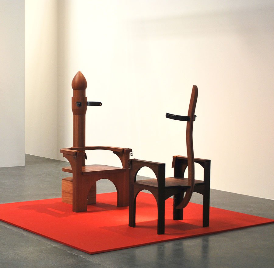 vs. The Ruler was made during the first year of the Arab uprising. It is comprised of two custom-made wooden 'electrocution' chairs (thrones) sitting in opposition to each other. The patriarchal male throne suggests the military and religion. Its counterpart is also suggestive of Islamic architecture, but is grounded by the human spine. Embedded with audio-scapes, the chairs invite audiences to sit and listen to the other's 'trial'. The male throne weaves excerpts of various public speeches from the region's threatened dictators, which are enunciated by a single voice. In turn, the female counterpoint reverberates with the feeds from my own social media community – status updates compiled from Twitter, Facebook and blog posts. The multiple voices assembled from the dictators and online community is compressed into the singular voice of one female and one male and can only be listened to by one audience member at a time, evoking the paradox of this age of digital media and networking, in which the global, disparate and intertwined voices of so many are in the end still filtered and understood through the narrow, singular mind of one person at the receiving end of it all.