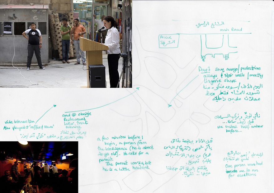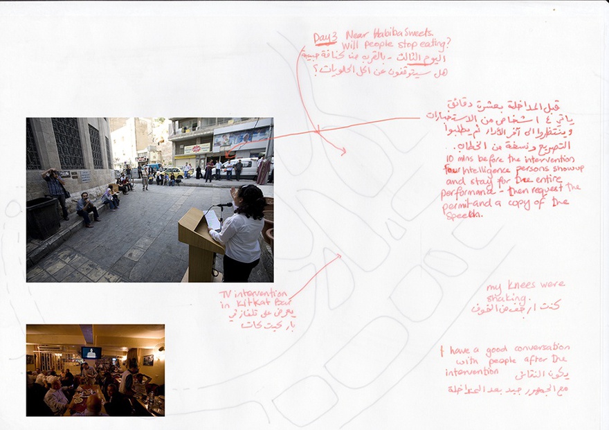 Not surprisingly, nothing akin to 'speakers corner' exists in Jordan, so critical debate or discussion around local or regional politics is avoided by people in the streets and public places, as it is also known that Jordan's intelligence system is very vigilant and intolerant. Additionally, at that time Jordanian law banned congregations in public space and any gatherings that symbolized a protest or a meeting needed permission from the municipality or state security.[1] The same applies to cultural performances.