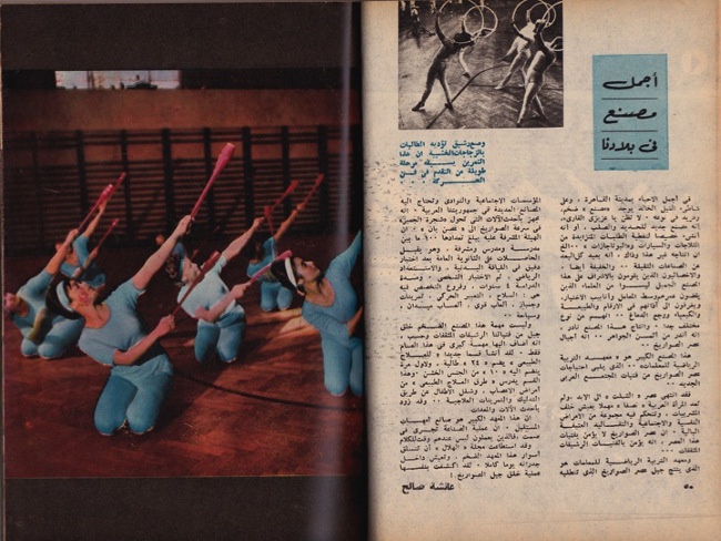 The previous images I have shown you so far accompanied an article that talks about an industrial building where the new fit bodies of women were being produced. The magazine where I found the photographs dates from 1958 and was printed in Cairo. At that time, publishing was already nationalized and the articles that circulated were clearly promoting a certain state project. The dance school was obviously part of it, as were the bodies dancing ballet. The new body had to learn ballet.