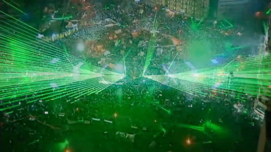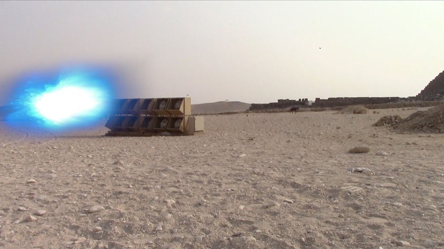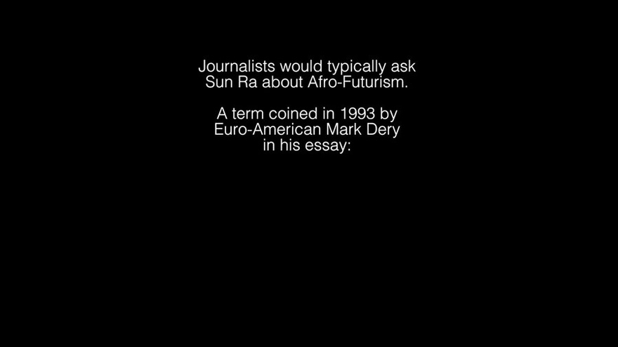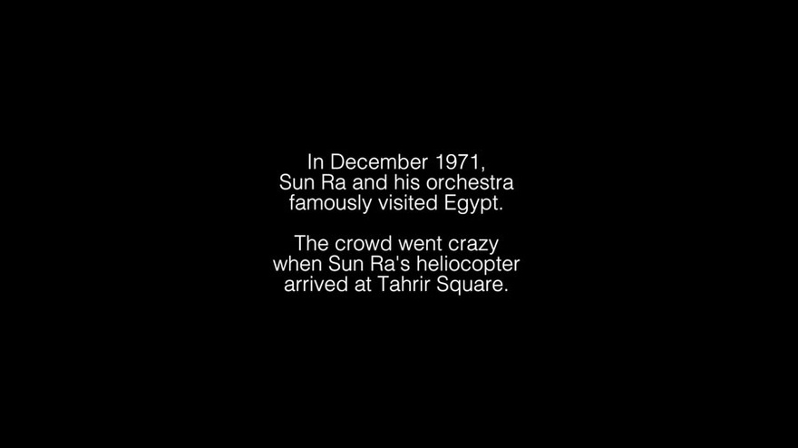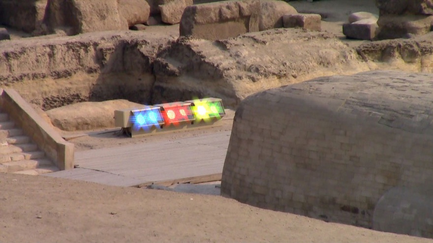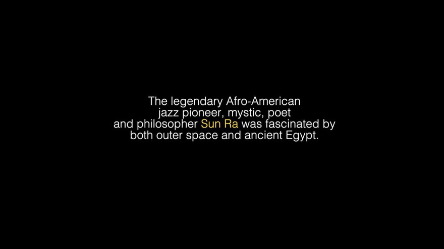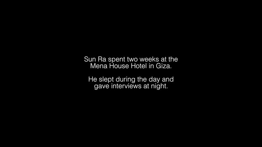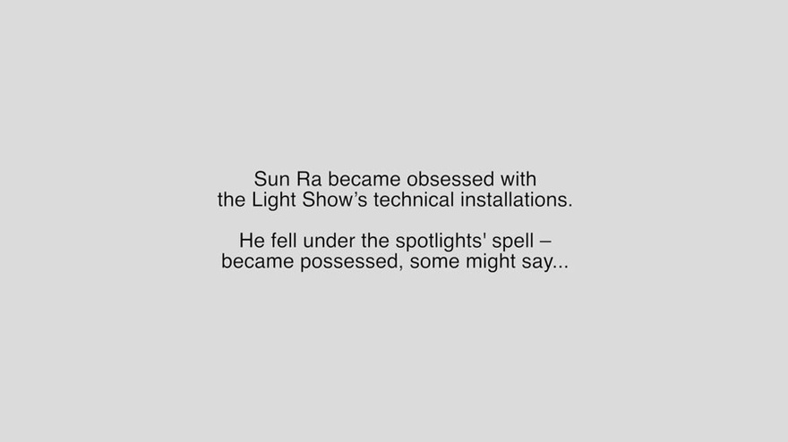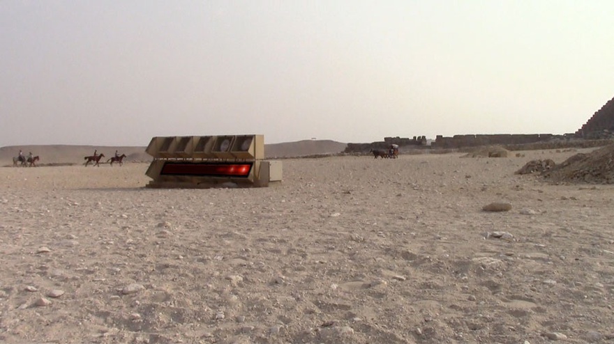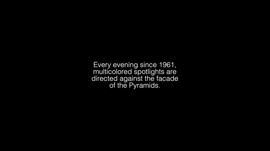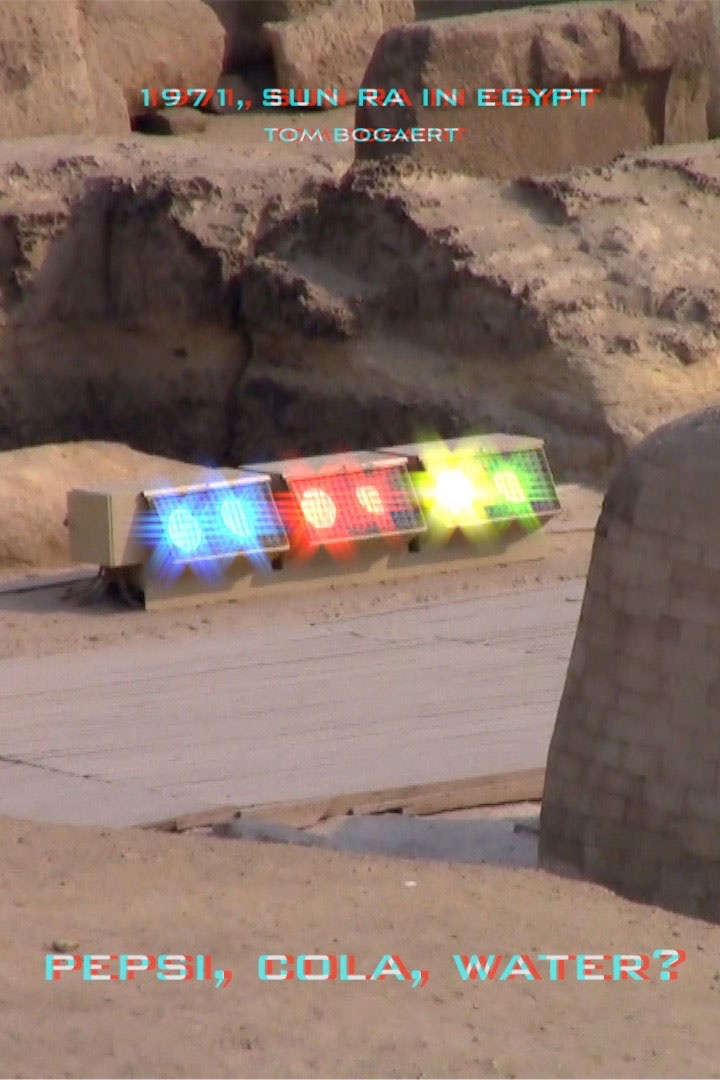Every evening since 1961, multicoloured lights of changing intensity are directed against the facade of the pyramids and the sphinx, synchronized with a soundtrack by Halim El-Dabh and accompanied by a dramatized history of the site as narrated by Omar Sharif. Bogaert's video shows footage of the light show's technical setup amid a sci-fi-worthy lunar landscape. Playing with the colour and rhythm of these light shows in relation to Sun Ra's work and performance, Bogaert incorporates computer animation, music by Sun Ra, as well as archive footage.