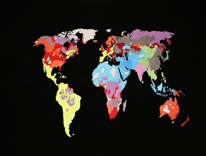 Map of Faith is a personal representation of the map of the world that sheds light on stereotypical viewpoints and offers a diverse perspective on traditional cartography based on geographic and political lines. It is a map of the world based on divisions by various religious groups. In today’s world, we, the global human community, recognise ourselves, our homelands, and our countries within political demarcations. In Map of Faith, embroidery has been used to unite regions, countries and civilisations. Fabric and thread create a sense of interconnectedness, joining through the stitches religions and peoples. The thread and fabric are delicate materials, creating fine lines, as fine as those connecting religion and civilisations. Religion today is more commonly viewed as a negative factor, that which destroys and disintegrates communities, whereas Map of Faith offers a view of religion as the main connecting factor in the world today, crossing borders and allowing communities to merge with one another.