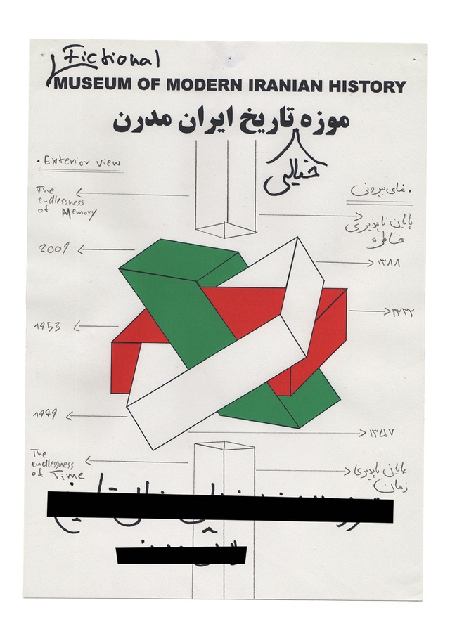 Stage 1 consists of architectural designs, models, maps and mockups regarding The Museum of Modern Iranian History. Historical chronologies of this fictitious but possible museum are based on a third-grade Iranian high-school textbook entitled Contemporary History of Iran (published by Education Ministry of I.R. Iran). The architectural system of the building on the other hand is inspired by the style of Persian miniature paintings.