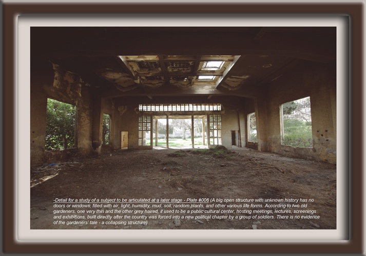 An encounter with an eponymous nineteenth century oil on canvas painting in the collection of the Museum of Fine Arts in Alexandria triggered a chain of reflections on the artist's classical training as a painter at the Academy of Fine Arts in Alexandria and the institution's complicated relationship to the language and values of contemporary art. Mahmoud Khaled proceeded to compile a concise lexicon of six terms that recur in art history books to define art practice. Process, material, detail, source, exercise and composition form the basis for six works that propose formal, poetic and associative interpretations of each term. Mixing autobiography and research, the series is presented from the perspective of a semi-fictitious student/artist on a field trip to Antoniades Gardens, a landmark Alexandrian garden modeled as a miniature version of Versailles Palace, and used as a standard location for outdoor assignments at the art academies.