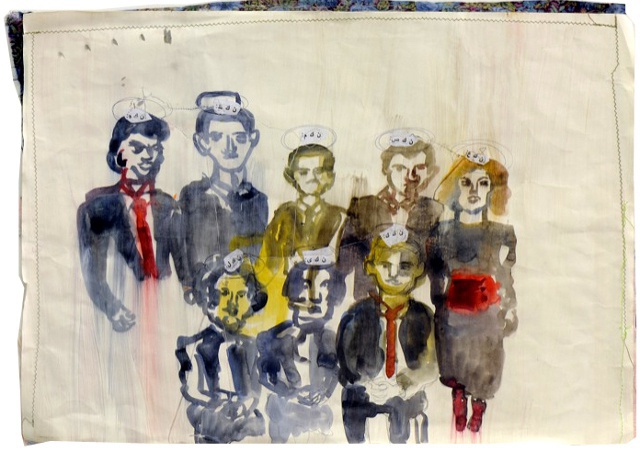 Image: From After Eight/self appointed kings (2014), watercolor, ink, pen and threads on paper.