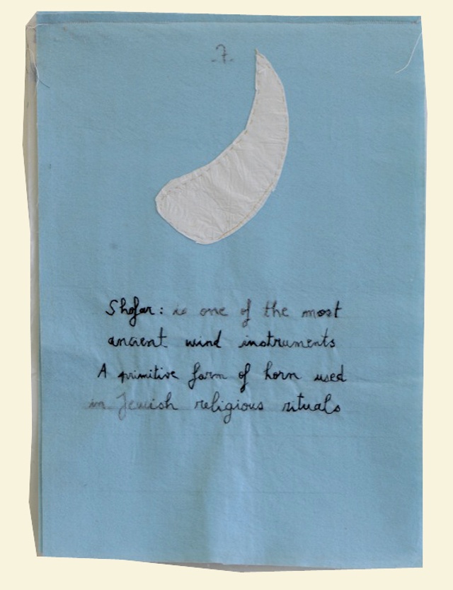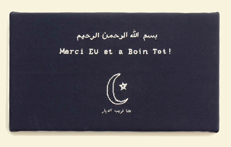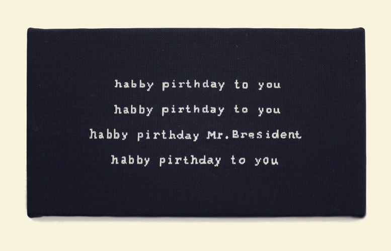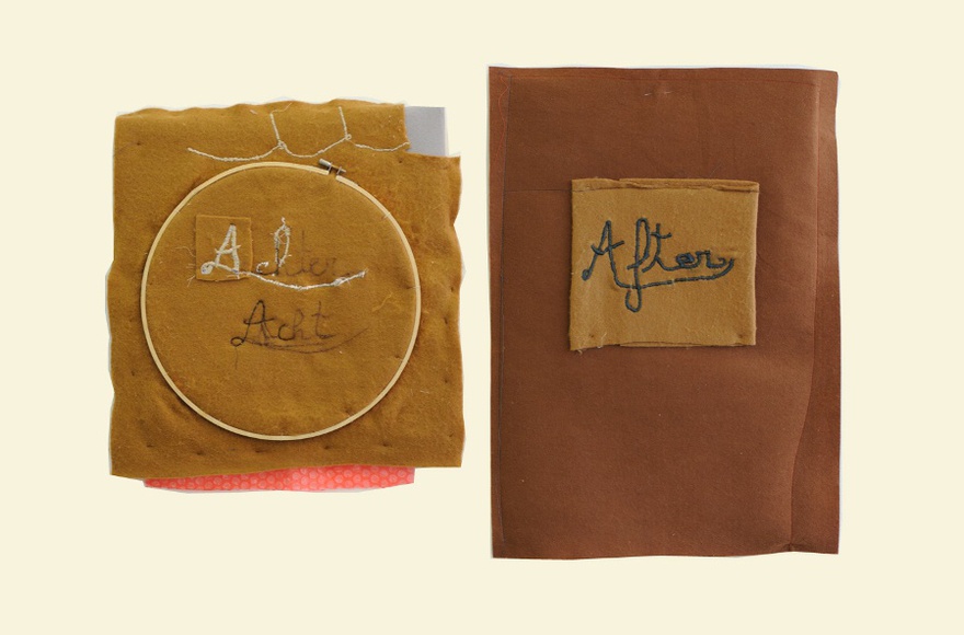 Some of those are part of a work titled After Eight (2014) and another one titled All Mother tongues Are Difficult (2014), which consist of a number of embroideries and hand-stitched media.