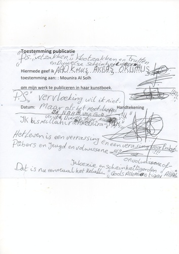15. Image: A photo of the permission addressed to me by Akbas who resided in Antwerp's asylum, and that allows me use of the love letter she has written during the workshop I gave there. The point of the workshop was for me to learn Dutch/Flemish - amongst other things I learned about myself.