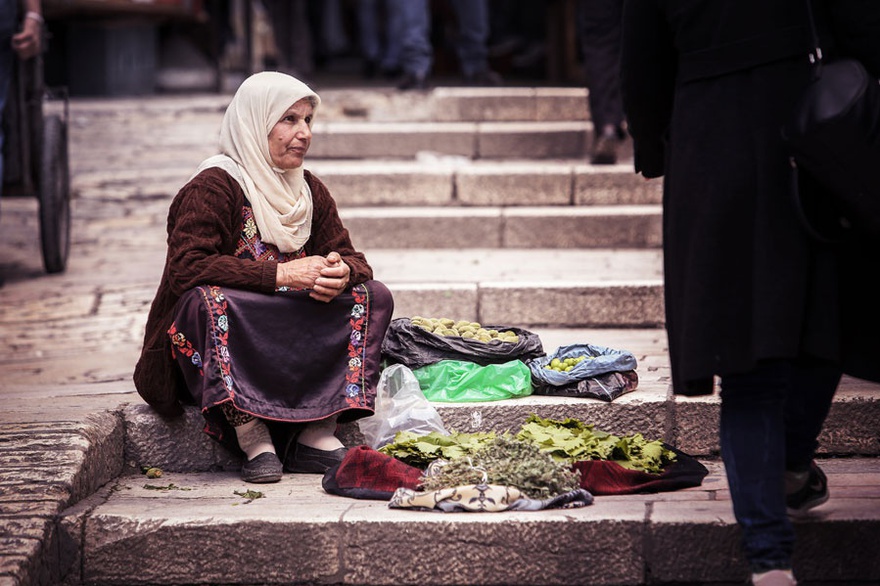 A woman sitting on the steps in the Old City of Jerusalem selling her produce.