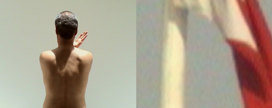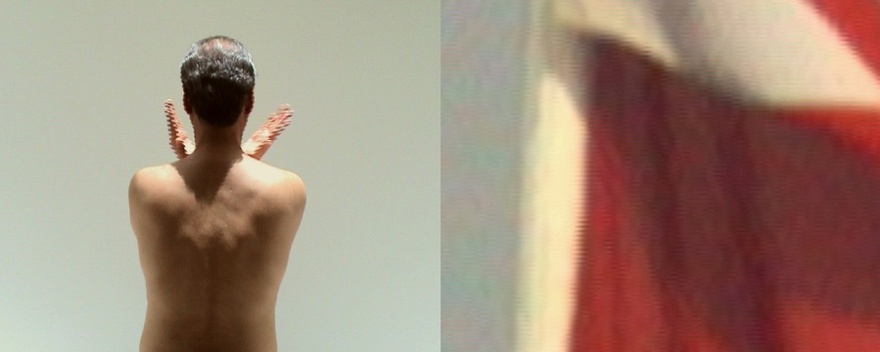 Anas Al-Shaikh's two-channel work My land, 2 consists of a close-up video of Bahrain's red-and-white flag and another presenting the artist's naked torso with his back to the viewer. As the flag begins to fly and music starts to play, the artist beats time on his face with a series of rhythmic, sharp slaps.