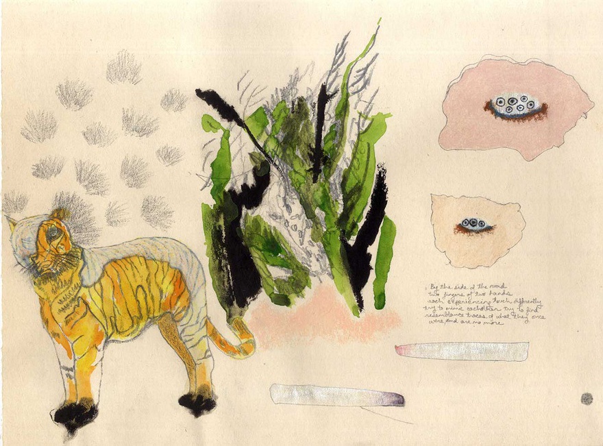 Encompassing drawing, performance and sculpture, Jumana Emil Abboud's A Happy Ending part II: Two Skins draws on motifs, characters and objects found in Palestinian folk-tales. The objects and figures in both her olive wood carvings and her drawings are depicted in the midst of metamorphosis. Caught between two states, these creatures are 'neither plant nor stone, animal nor human, good nor evil.'