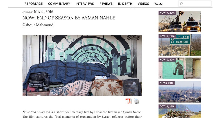 The Abounaddara collective is an anonymous group of self-taught filmmakers who present an alternative to the mainstream coverage of the country's fractured state, with its focus on conflict and destruction. Abounaddara has posted nearly 300 videos on Vimeo, one every Friday, and has attracted an international audience. Abounadarra's films have been screened as part of the Human Rights Watch Film Festival and also took part in the Venice Biennale in 2015.