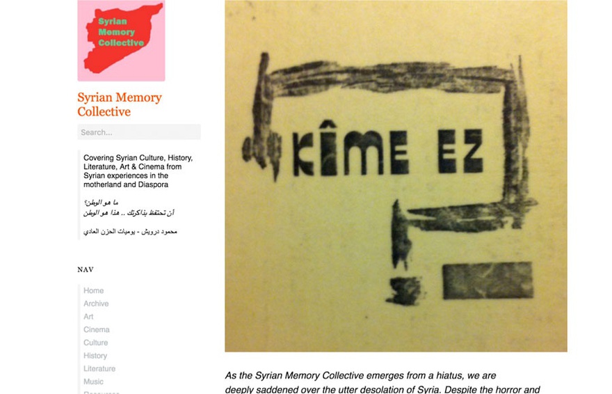 Syrian Memory Collective is an online archive of culture, history, literature, art and cinema, covering Syrian experiences both in the motherland and the diaspora. The site collects stories, art works and documentaries in a blog format.