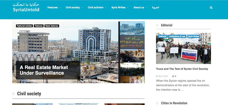 Syria Untold is an independent digital media project exploring storytelling from the Syrian struggle and from its diverse forms of resistance. It is run by a collective of Syrian writers, journalists, programmers and designers living in the country and abroad who are trying to highlight the narrative of the Syrian revolution, which Syrian men and women are writing day by day. Through grassroots campaigns, emerging forms of self-management and self-government and endless manifestations of citizen creativity, a new outspoken Syria has emerged, after decades of repression and paralysis.