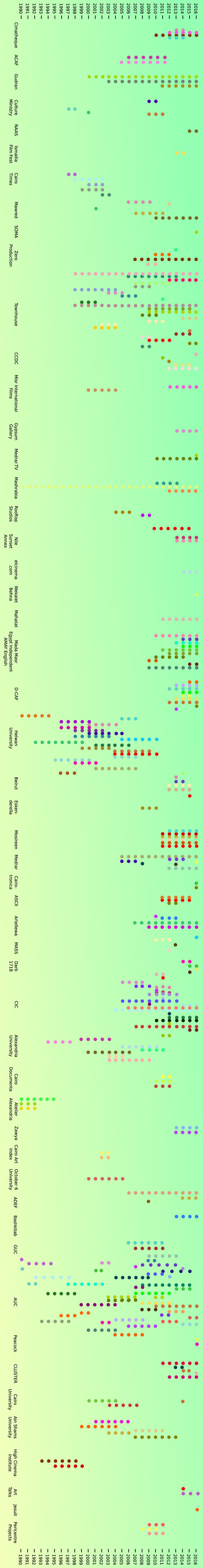 The resulting data can be seen in the chart below. Because the histories of these institutions tend not to be well documented, there are some blank spots in terms of who worked with whom, and some institutions have ceased operating and disappeared from collective memory. People were consulted through a Google questionnaire sent via email, Facebook and Whatsapp, and then follow-up questions were asked where necessary by email, Facebook, Whatsapp, telephone or in person. People's names have been removed, but each person has been allocated a different colour so that their progress can be followed over time, and the name of each institution holds a hyperlink to further information about it, mainly through independent Egyptian news site Mada Masr.