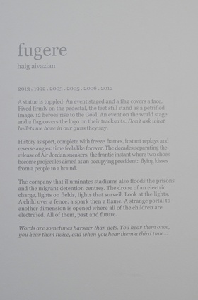Aivazian was born in Beirut in 1980, where he also presently resides. He studied at the Skowhegan School of Painting and Sculpture in Maine and earned an MFA for art practice and theory at Northwestern University in Chicago. He recently presented his first major solo exhibition at the Hamburg venue of Andrée Sfeir-Semler (November 2, 2013 to January 5, 2014), who also operates a gallery in Beirut. Extending his series FUGERE (A series of Olympiadic Events), ongoing since 2009 and named after the Latin verb 'to flee', Aivazian composed two multi-layered, intertwining narratives for his presentation in Hamburg. The artist himself described his project FUGERE as 'an exploration into the strangeness of the realm of professional sport: a loaded intersection of franchise deals and the disenfranchised, nationalism and statelessness.' It is a realm where a Brazilian shoeshine boy, like Pelé, kicking around a grapefruit in the street with his pals, can become a soccer god. It is also the realm of fleeting fame, where players are stars for 15 minutes before sinking back into oblivion. It is the realm of big business and high hopes, of equal opportunities and global enterprise. Where the game of life is played out in miniature wars between rival teams. Where the peaceful coexistence of national and cultural heritages is no longer a dream but, for the duration of a match, happens in real time.