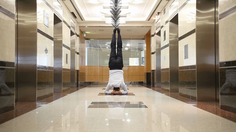 The other single-screen film projection, Crisis and Control (2013), is a series of interviews undertaken with workers while they perform yoga positions in their offices in full work dress. Their responses revolve around notions of power in the workplace. A male worker insists his colleagues understand that when he is strict with them it is merely a professional tactic and not part of any personal grievance. A younger female worker explains how she plans to remove herself from her current position in the corporate structure to start her own business.